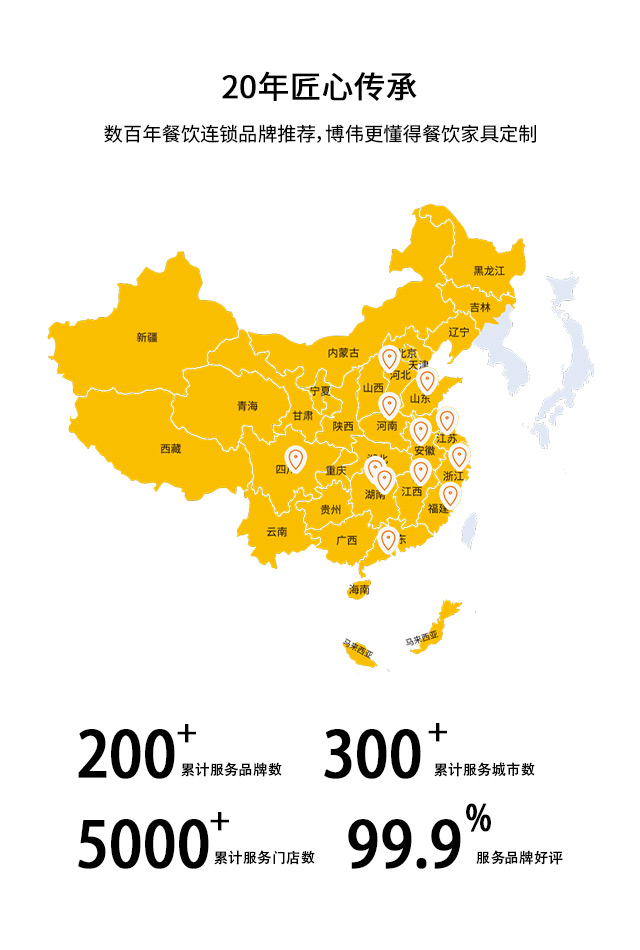 博偉餐飲家具專業(yè)服務(wù)餐飲家具20余年,先后服務(wù)1000+連鎖餐飲,業(yè)務(wù)覆蓋10多個(gè)省份300+城市,用好原料做好桌椅,全國質(zhì)保,注重品質(zhì)服務(wù)。